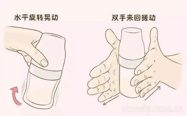 正解:不要上下摇晃奶瓶,应该用手腕的力量,左右摇晃奶瓶,或者两手手掌握住以后,沿水平方向揉搓奶瓶。